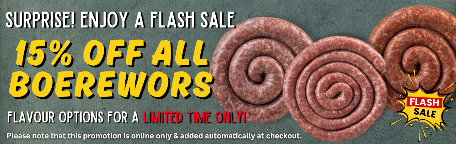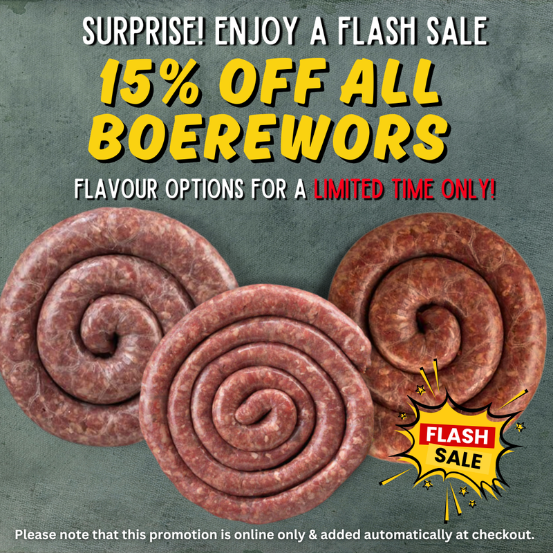 When it comes to the Braai, we don’t compromise. We craft our Boerewors with care, offering bold and traditional flavours such as Farmstyle, Plaaswors, Chakalaka, Garlic, and Venison.