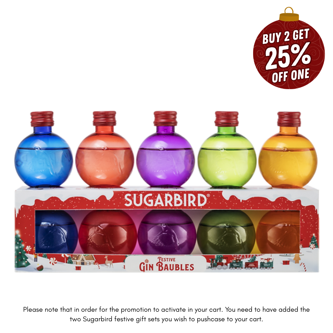 Each pack of Baubles contains 5 different award-winning Sugarbird Gin variants in 5 different colours.