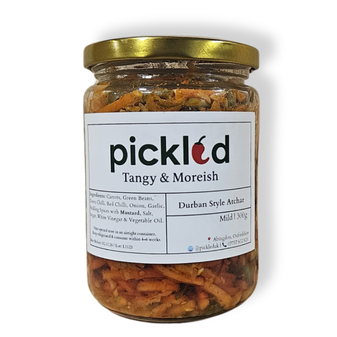 Carrots, Green Beans, Green Chilli, Red Chilli, Onion, Garlic, Pickling Spices with Mustard, Salt, Sugar, White Vinegar & Vegetable Oil.